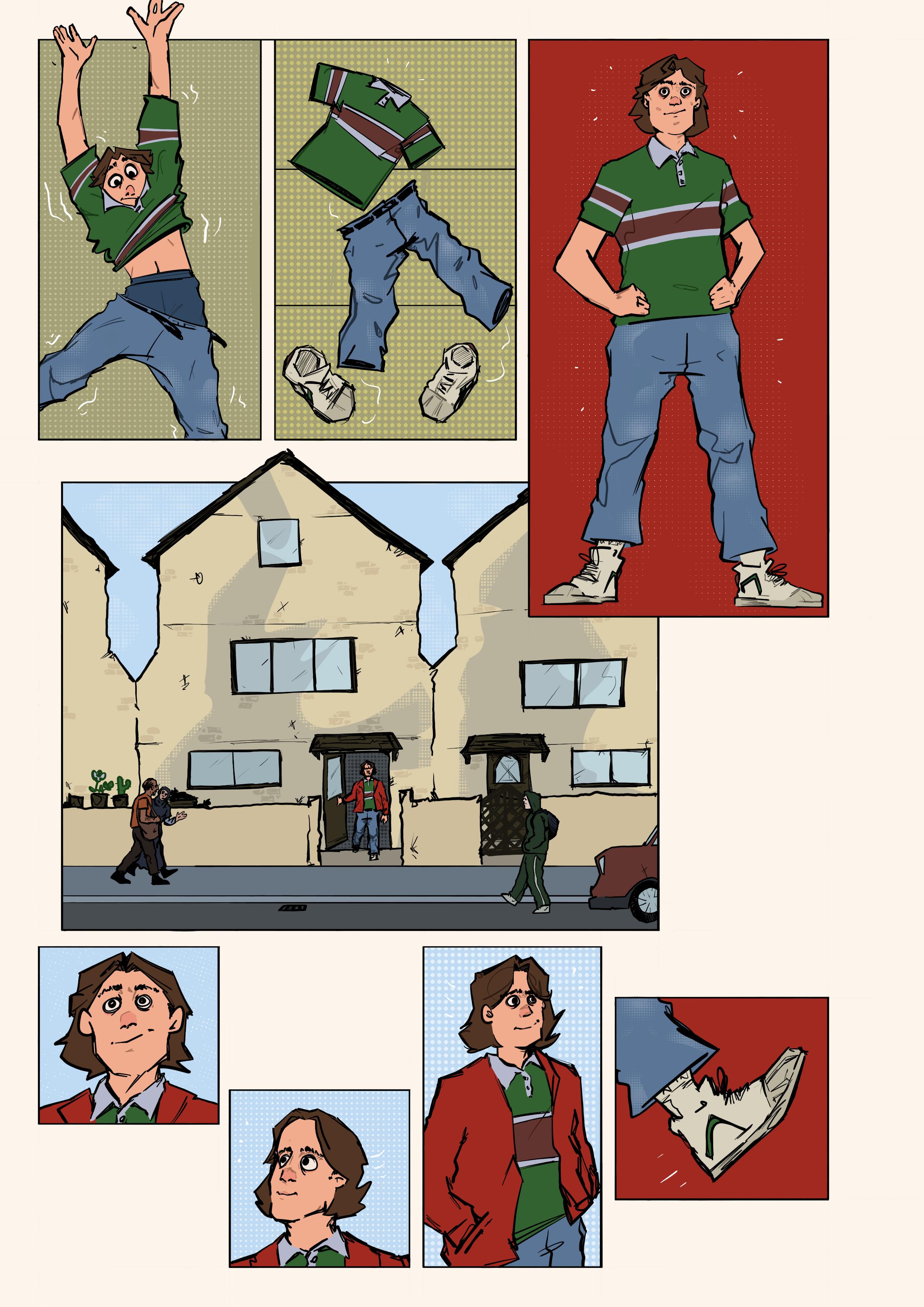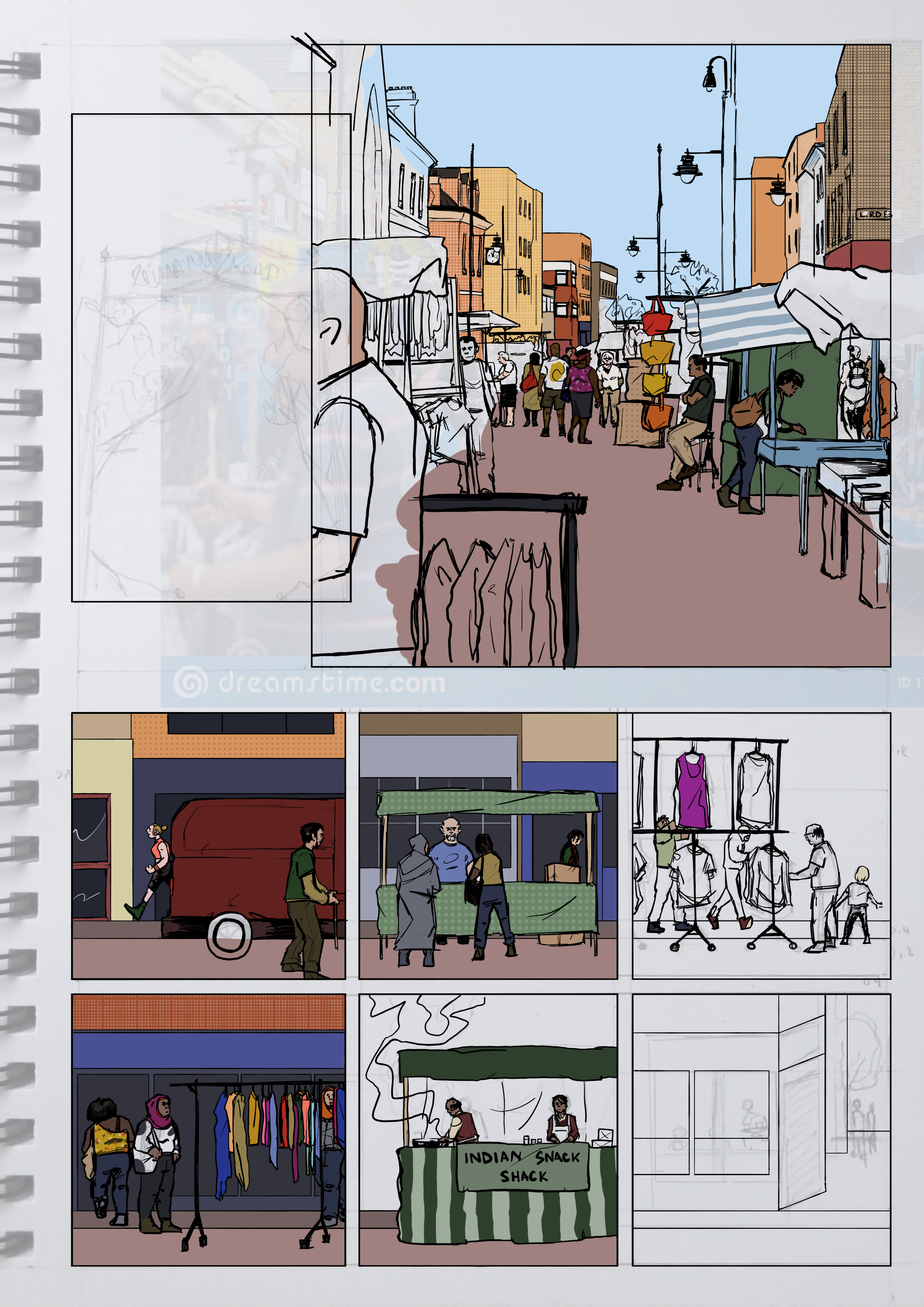 A concept for a wordless graphic novel. I chose to base this off my experiences in my first student house. I felt so insanely passionate about living in Bow, East London in my second year so it was a no-brainer for creating art. I lived just of Roman Road and the market, between that street and Victoria Park. Check out the pages I produced and one final unfinished one, which of course is of Roman Road Market so there was no way I wouldn’t have it up on this site.